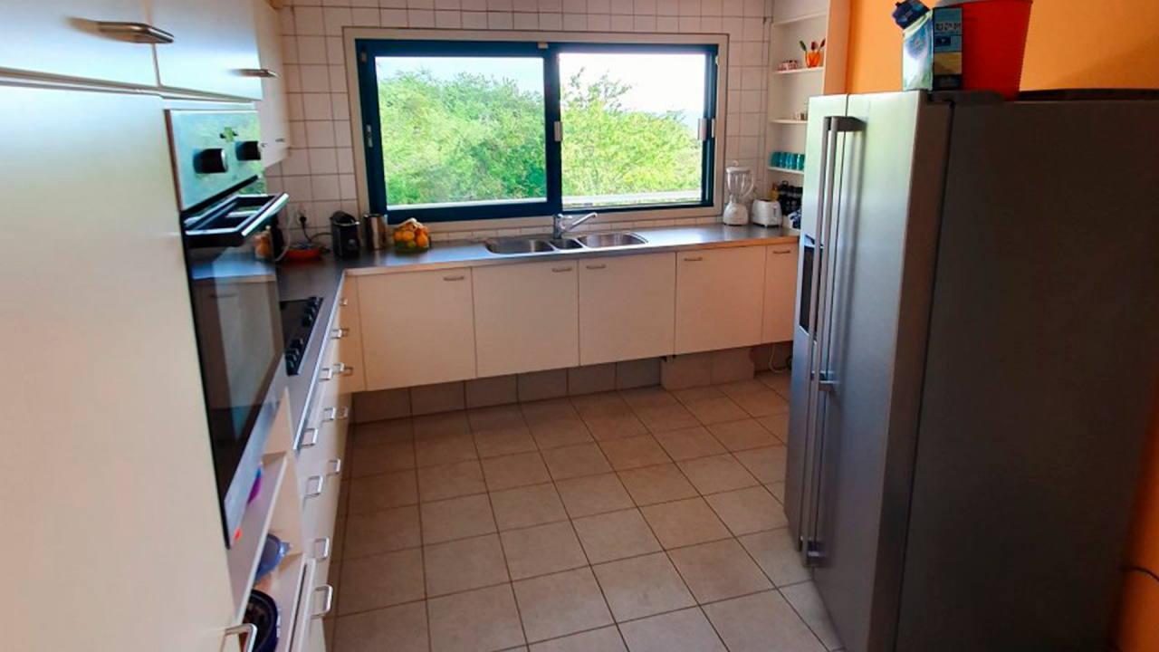 Ruime keuken met uitzicht over zee. voorzien van oven, vaatwasser, inductie kookplaat, nespresso koffiezetter en meer. Uiteraard ontbreekt een grote koelkast met ijsblokjesmaker niet.